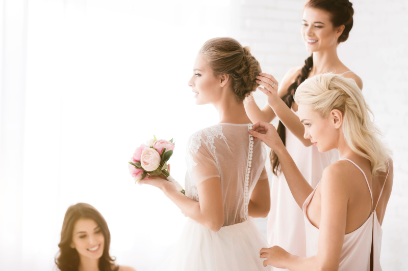 ヘア・メイクが完了したら衣装の着付けです。ドレスに響かないブライダル用の下着を身に着けておくと体のラインも綺麗に見えますし、脱ぎ着もスムーズに行えます。着付けと同様にブライダル小物もつけていきます。