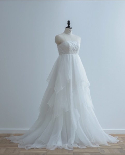 ボリューム感の多いエンパイアタイプのドレスもおすすめです。同じシルエットでも素材の質感などで大分印象が変わりますが、写真のタイプだと 柔らかい素材を表面に使用しているため、ボリュームがありながらも軽やかに着て頂ける一着です。